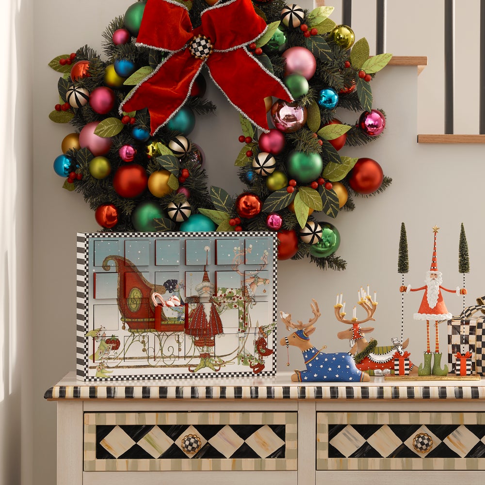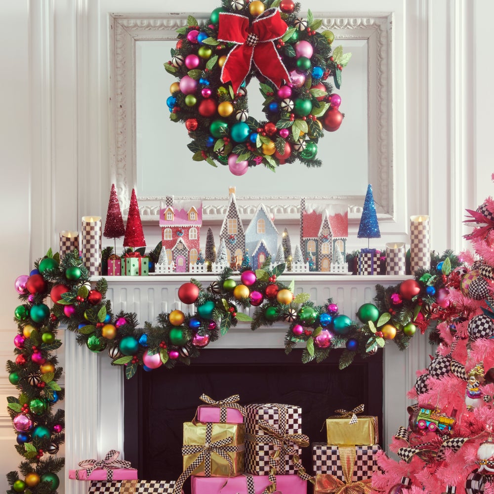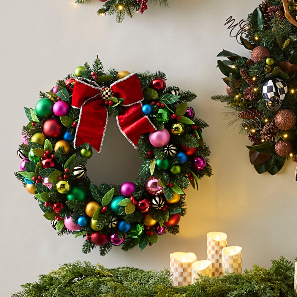 Deck the halls, the doors or above the mantel with this wreath, accented with shatter-resistant ornaments, glittered felt leaves, and trimmed with tinsel-edged red ribbon.