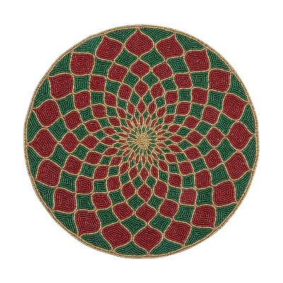This placemat adds sparkle to the table, embellished with red, green, and golden color beads in an intricate pattern reminiscent of those seen in a kaleidoscope.