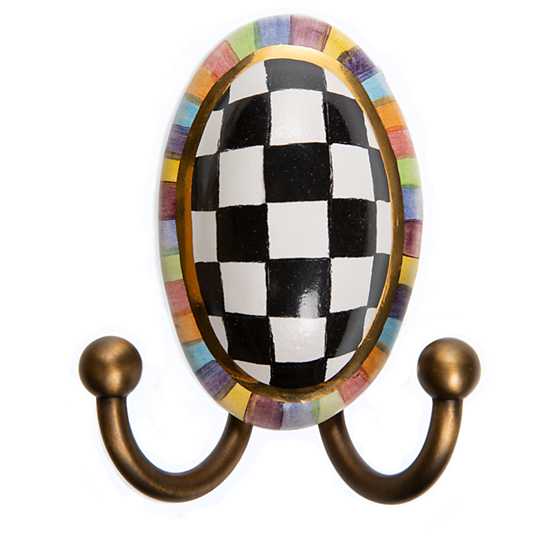 While quite handsome from any distance, the intricate splendor of our Kaleidoscope Hook emerges upon closer inspection. Hand-painted onto an oval silhouette of hand-glazed ceramic, our signature black and white checks are outlined with colorful stripes, framed with a wide, glittering band of gold lustre. Two handy hooks provide the perfect place to hang oven mitts in the kitchen, bathrobes in the powder room or keys in the foyer.