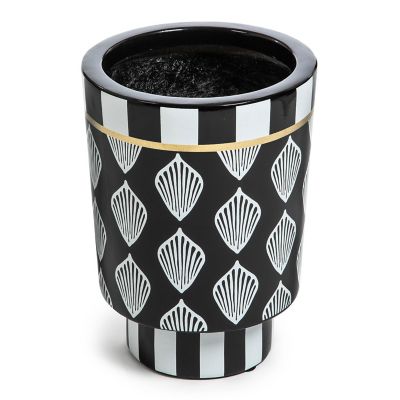 Give your plants a stylish home with this 12½” fiberglass planter, featuring a black and white leaf and stripe pattern, trimmed with a golden decal.