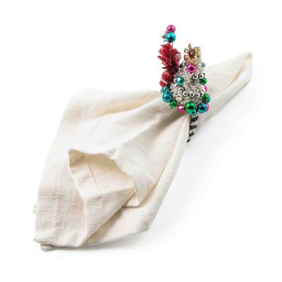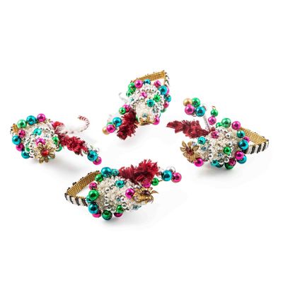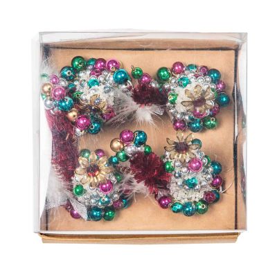 Add jewelry to your table with this set of four napkin rings made of a medley of beads on a frame of iron and brass. A band of black and white beads wrap around the napkin.