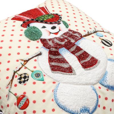 Deck the sofa with this one-of-a-kind holiday pillow, featuring a printed and machine-embroidered snowman, embellished with shimmering threads and all sorts of beading, including bugle beads on the snowman’s hat and scarf. It’s finished with black and white twisted cording.