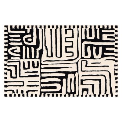 This 2’3″ x 3’9″, New Zealand wool-blend rug features dimensional tufted and sheared black and ivory patterns inspired by traditional African Kuba cloth.