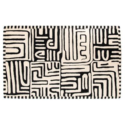 This 3′ x 5′, New Zealand wool-blend rug features dimensional tufted and sheared black and ivory patterns inspired by traditional African Kuba cloth.