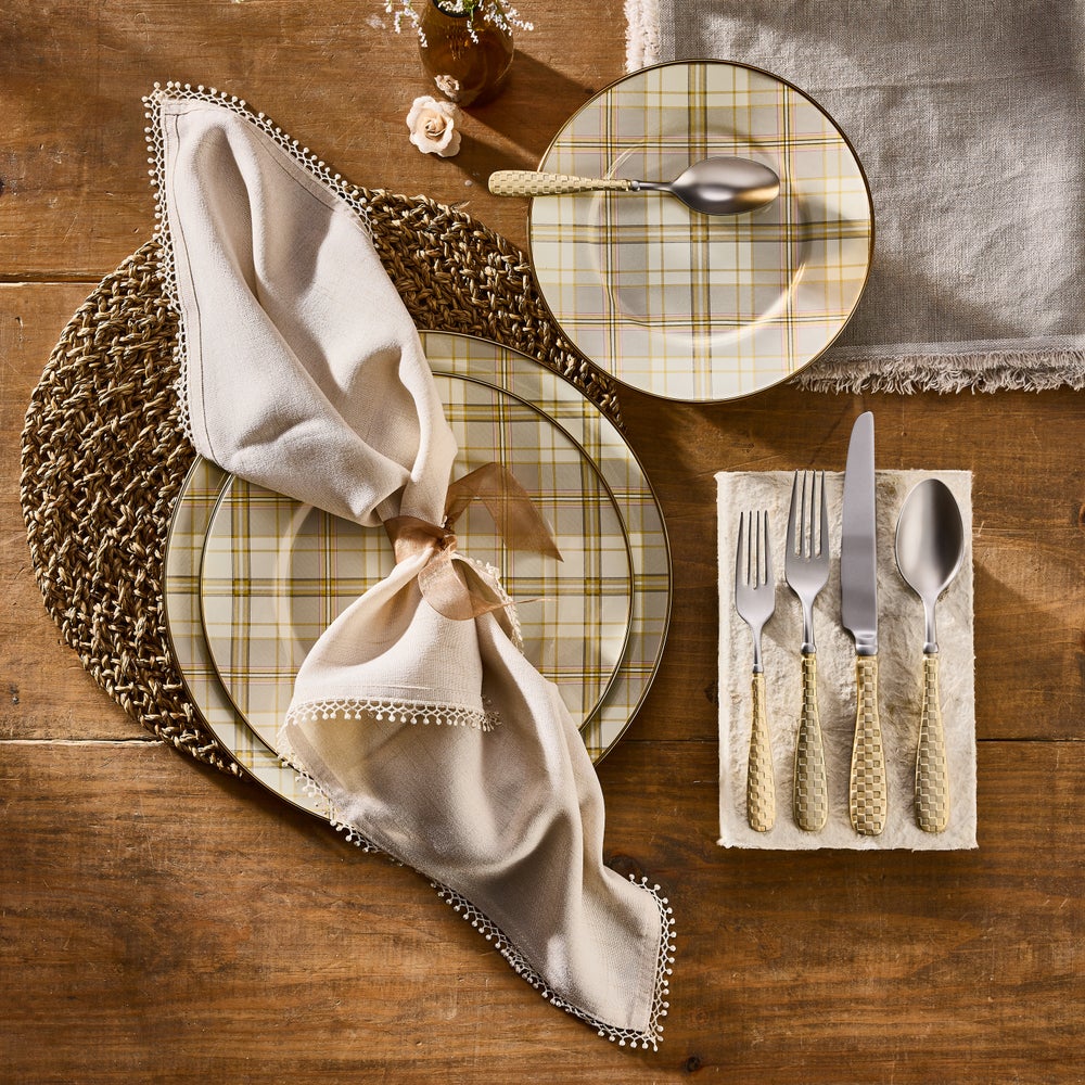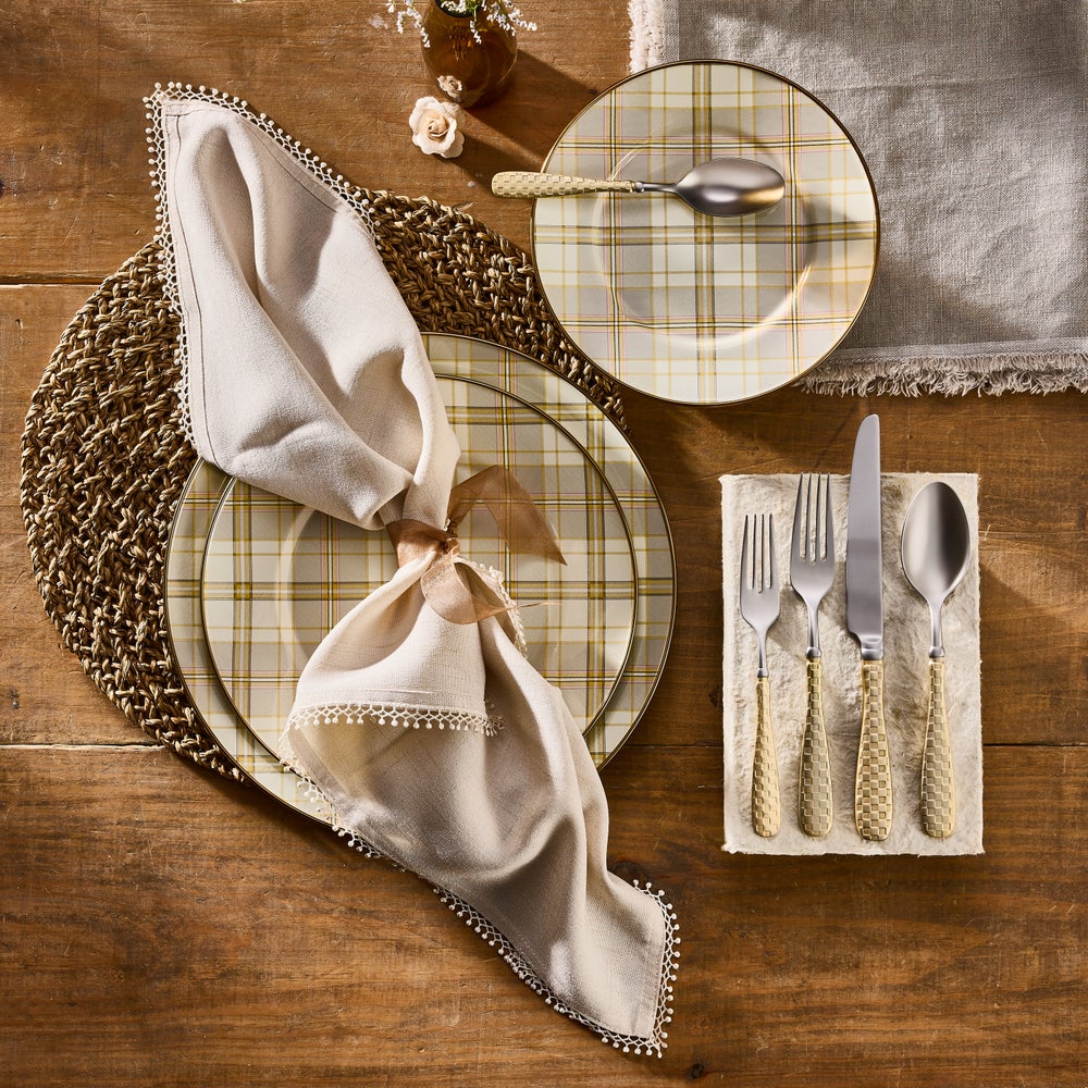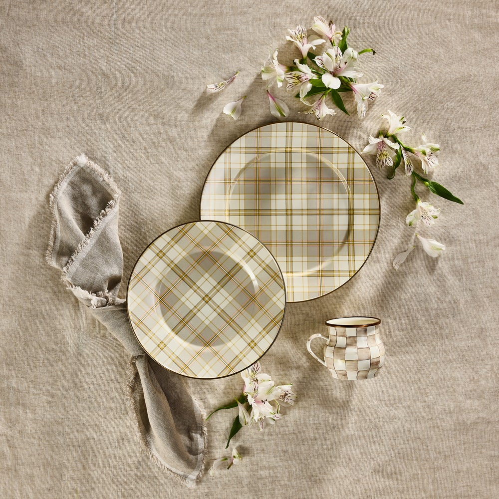 Set a place at the table for Latte Tartan Dinnerware. It’s made of heavy-gauge steel, embellished with hand-applied transfers, and rimmed in bronzed stainless steel.