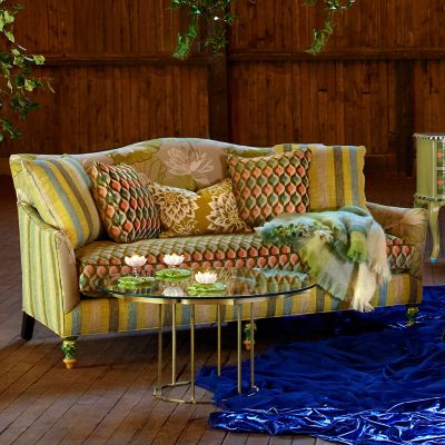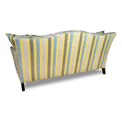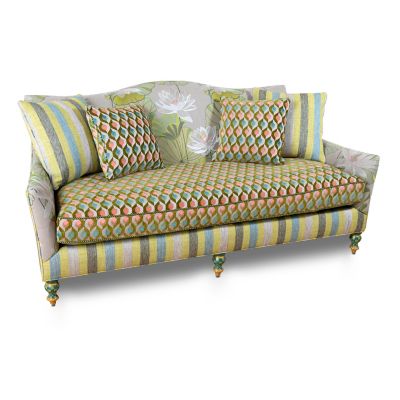 Inspired by the picturesque pond on our farm, our Lily Pond Sofa features a curved tight back dressed in three woven and embroidered patterns, trimmed with green checked cord, over a domestic hardwood frame. The ample loose seat cushion reverses from a lily print to a dimensional geometric design. This sofa comes with four toss pillows that reverse from stripes to geometric print. The finishing touch, added by our Aurora artisans, is hand-painted green checks with golden accents on the exposed wooden feet.