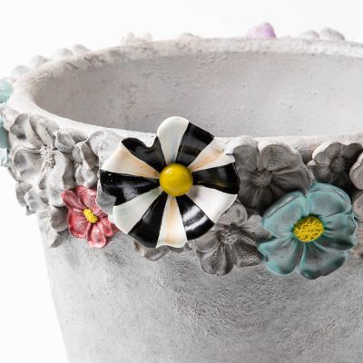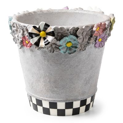 This large pot, made of resin with a concrete finish, features dimensional, hand-painted florals and a Courtly Check® and Stripe dragonfly. Place a container plant—real or faux—inside and prepare for the rave reviews.