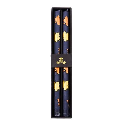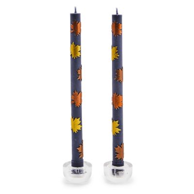 This set of two hand-rolled, beeswax-blend dinner candles sets the scene for fall, featuring a hand-applied metallic maple pattern.