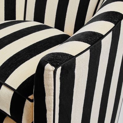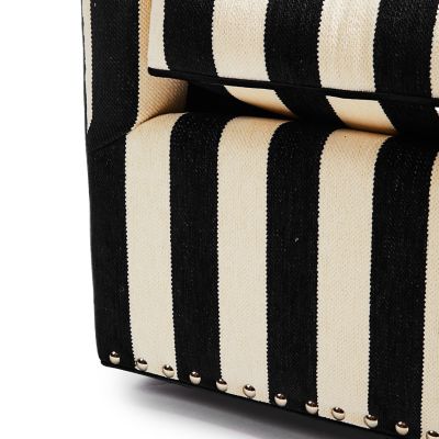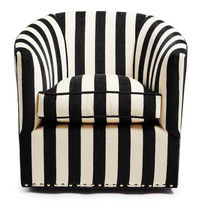 The Marquee Black Stripe Chenille Swivel Chair is a sleek silhouette that mixes and matches with solids and patterns. This piece, with a rounded barrel back, turns 360 degrees. Its domestic hardwood frame is wrapped with upholstery-weight chenille and is accented with pewter nailhead trim. Our exclusive fabric decking is underneath the loose seat cushion.