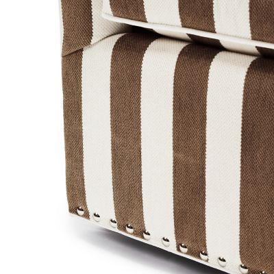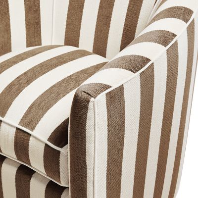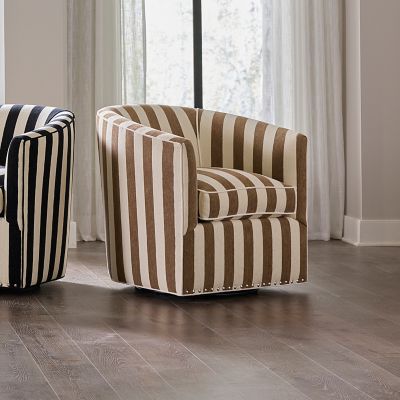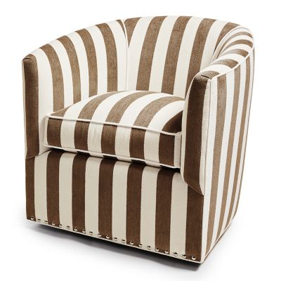 The Marquee Brown Stripe Chenille Swivel Chair is a sleek silhouette that mixes and matches with solids and patterns. This piece, with a rounded barrel back, turns 360 degrees. Its domestic hardwood frame is wrapped with upholstery-weight chenille and is accented with pewter nailhead trim. Our exclusive fabric decking is underneath the loose seat cushion.