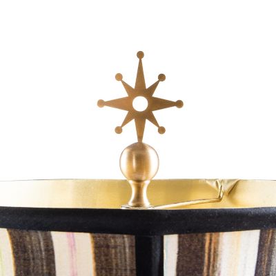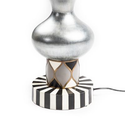 No matter where your gaze rests, the Marquee Floor Lamp is every inch a grandly beautiful composition. Decorated in tiers of black, grey, and pewter, with intricate metal accents, it’s topped with a custom Courtly Stripe bell-shape shade and a metal sunburst finial.