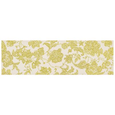 Add timeless MC style to your floors with this 2’6″ x 8′, chartreuse floral pattern rug made of 100% looped New Zealand wool.