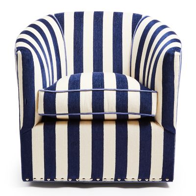 The Marquee Navy Stripe Chenille Swivel Chair is a sleek silhouette that mixes and matches with solids and patterns. This piece, with a rounded barrel back, turns 360 degrees. Its domestic hardwood frame is wrapped with upholstery-weight chenille and is accented with pewter nailhead trim. Our exclusive fabric decking is underneath the loose seat cushion.