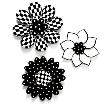 Our set of three metal dimensional Marquee Wall Flowers blossom on your walls in different sizes, decorated with black and white patterns and gold hand-painting on the edges.