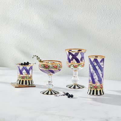 Make any occasion more special by setting the table with this hand-painted, mouth-blown coupe glass. Featuring a pattern of lavender ribbon swirls and pink roses atop a pearlescent stem set on a hand-painted Courtly Stripe base, it’s trimmed with gold lustre.