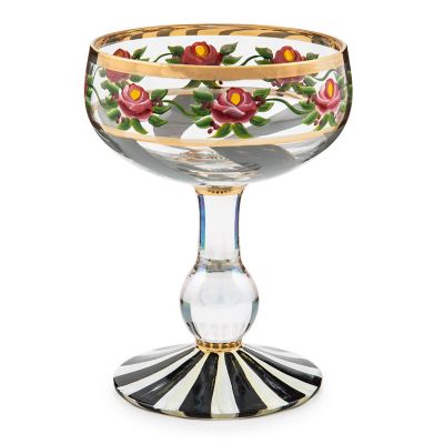 Make any occasion more special by setting the table with this hand-painted, mouth-blown coupe glass. Featuring a pattern of grey ribbon swirls and pink roses atop a pearlescent stem set on a hand-painted Courtly Stripe base, it’s trimmed with gold lustre.