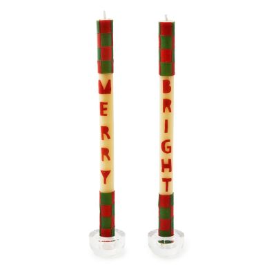 This set of two hand-rolled, beeswax-blend dinner candles sets the scene for the holidays, featuring hand-applied holiday words and red and green checks.