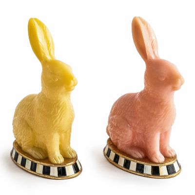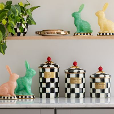 Inspired by vintage milk glass, these orange and yellow rabbit figures sit on hand-painted Courtly Stripe bases, trimmed with roped gold foil. Perfect for the spring kitchen, of course, but you’ll want to display them year-round.