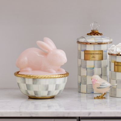 Inspired by vintage milk glass, this container has a pink rabbit atop a hand-painted Sterling Stripe base, trimmed with roped gold foil.