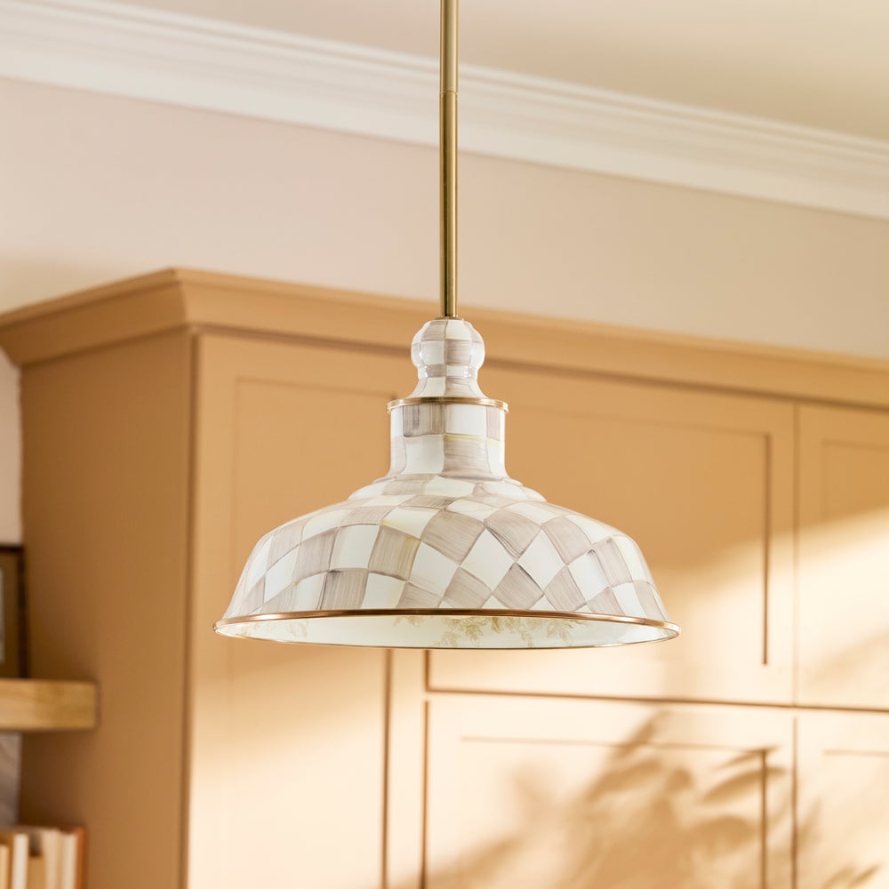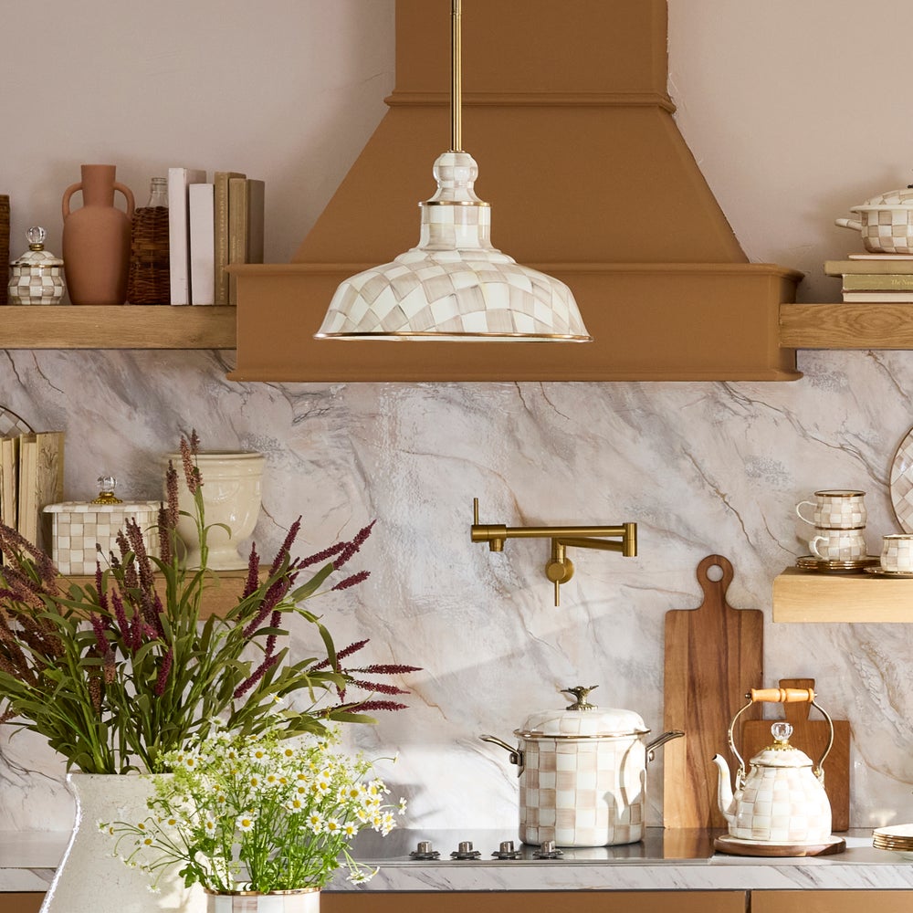 Our Mocha Check 18″ Barn Pendant features a simple silhouette in our signature MacKenzie-Childs checks to elevate this iconic light fixture. With its espresso-inspired pattern, this pendant light would look right at home over the kitchen island.