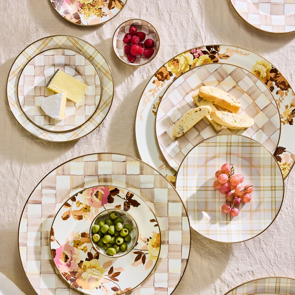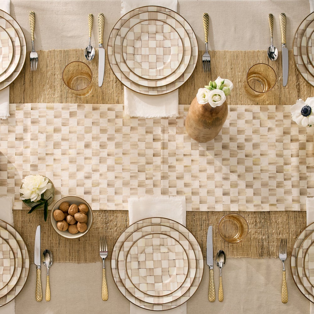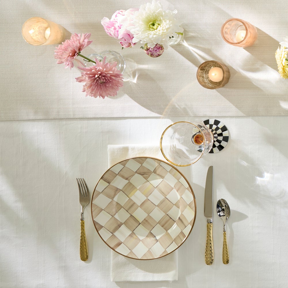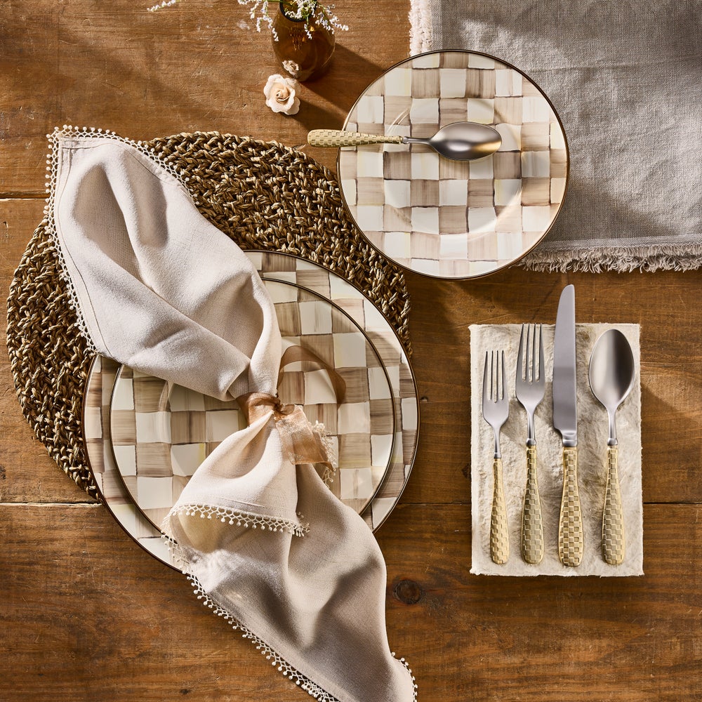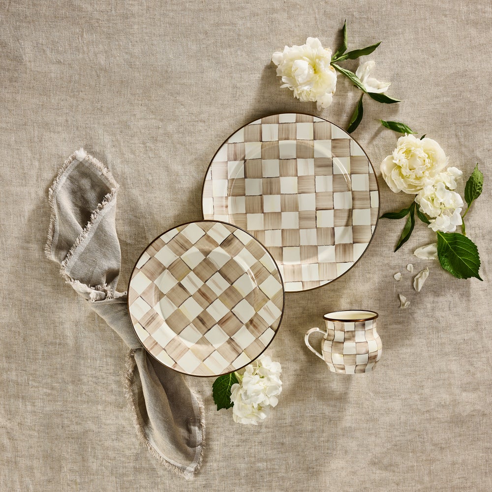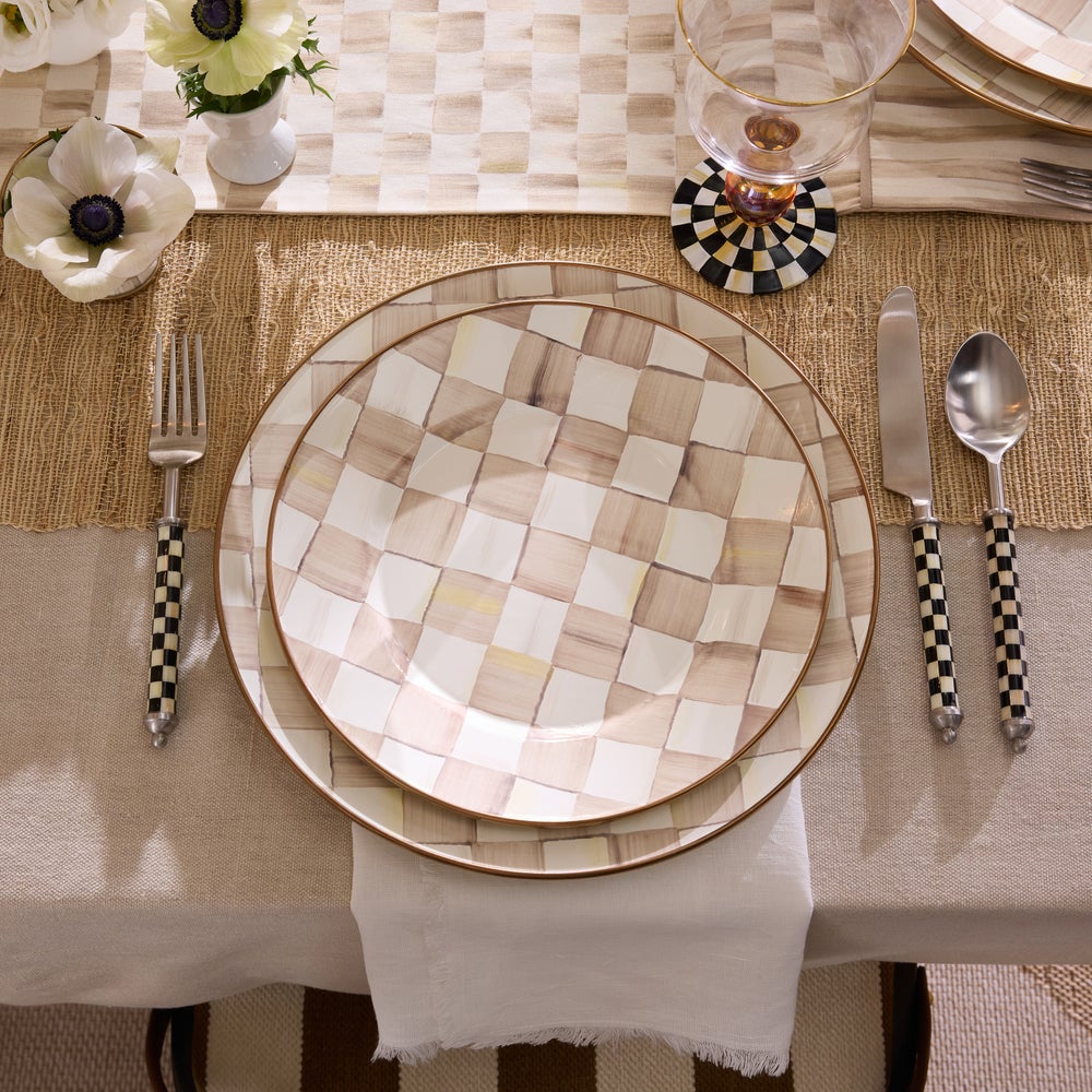 Set a place at the table for our Mocha Check Enamel Dinnerware. Similar in theme to our signature enamel Courtly Check pattern, Mocha Check features coffee-colored checks that are hand-painted and rimmed in bronzed stainless steel.