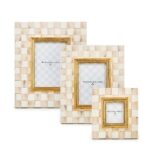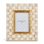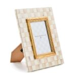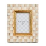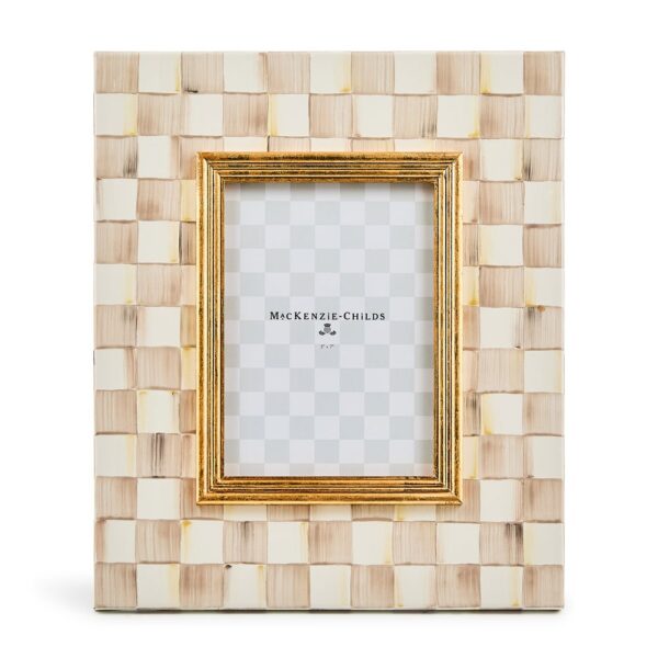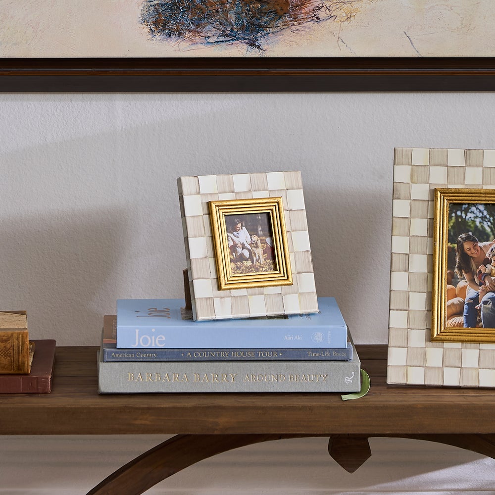 The picture-perfect Mocha Check Frame features hand-painted Mocha Checks on a steel underbody and is backed with linen with a brass logo plate. Its elegant design makes it a stunning way to display your favorite photos or cherished memories, adding a touch of warmth and charm to any room.