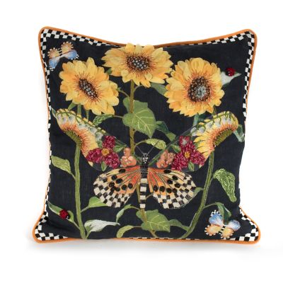 Take a flight of fancy with the Black Monarch Butterfly Square Pillow. Accented with dimensional flower petals, French knots, and chenille stitching, it’s edged with an embroidered black and white checked border and finished with orange cording. Sunny and sensational, it’s sure to add MacKenzie-Childs style wherever you choose to plant it in your interiors.