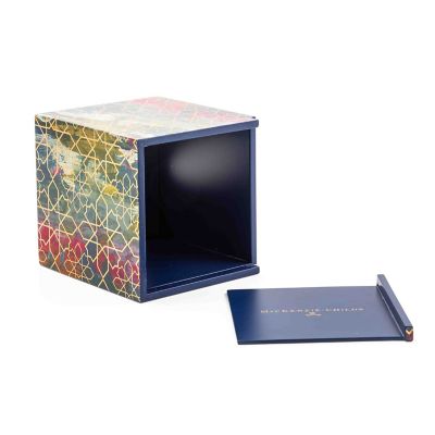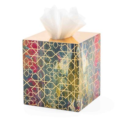 Layers of artistry go into making this pretty and practical boutique tissue cover, featuring a printed design, accented with gold foil, and then topped with multiple coats of lacquer.
