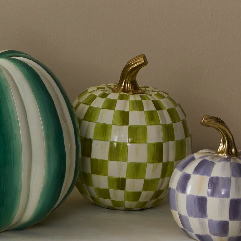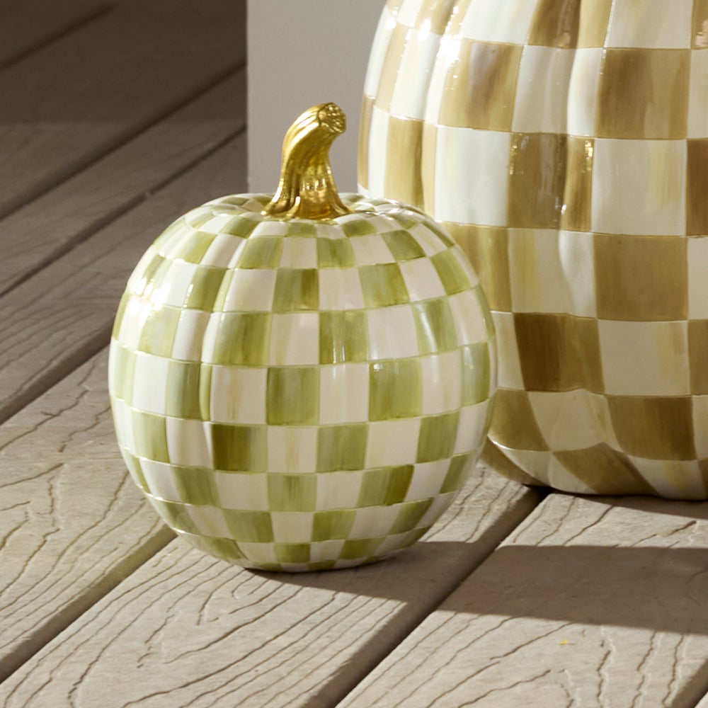 Take your pick from our truly unique pumpkin patch with the Moss Check Small Pumpkin. Decorated in our moss green checks and topped by a glimmering gold stem, this decorative gourd is sure to be a favorite in any autumnal display.