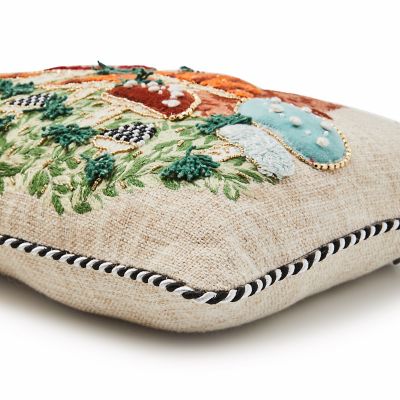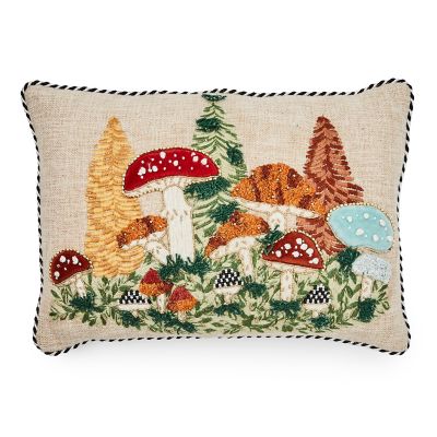 Accent your harvest home with this lumbar pillow. It features mushrooms, including some that are dimensional, done in chenille embroidery and beads and is finished with black and white check piping.