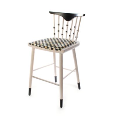 Strike all the right notes with our Musical Chairs collection. The Musical Chairs Counter Stool is a perfect perch in The Entertaining Kitchen™. Made of European beechwood with a milky finish that shows the wood grain, it features applied vinyl dots on its spindle back with cross supports of brushed aluminum. The cushioned seat is upholstered in our signature checked fabric.