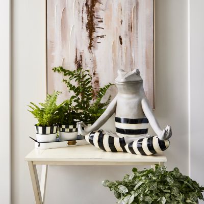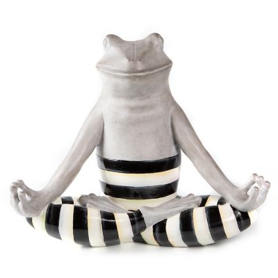 Strike a pose—a yoga pose, that is—with our Namaste Frog. Made of resin with a concrete finish, this frog, wearing Courtly Stripe yoga pants, finds zen in a meditation pose. If displayed outdoors, put in a protected location.