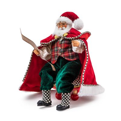 Have you been naughty or nice? This hand-painted Santa knows all and is checking his list twice, wearing a velveteen coat and tartan vest, and sitting on a Courtly Check® tuffet.