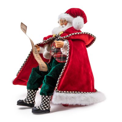 Have you been naughty or nice? This hand-painted Santa knows all and is checking his list twice, wearing a velveteen coat and tartan vest, and sitting on a Courtly Check® tuffet.