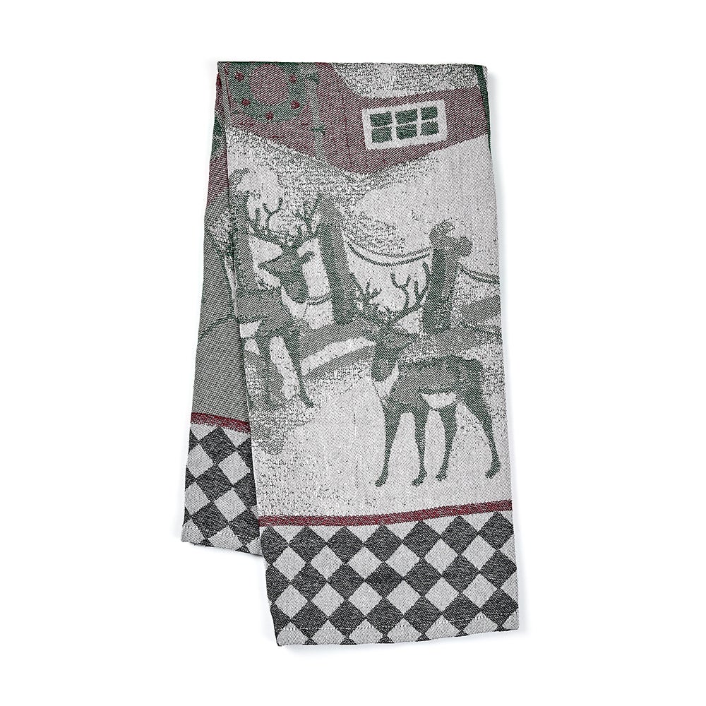 Fun and functional, this woven jacquard New England Jacquard Dish Towel features a wintry New England scene, bordered with diamond checks.