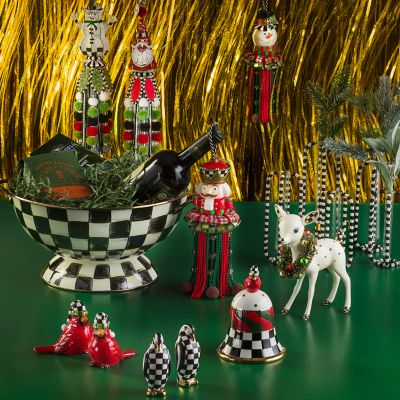 You’ll want to salute the Nutcracker Tassel and its snappy style. A hand-painted ceramic top features a nutcracker, trimmed with a skirt of red and green fringe. Hang it from its twisted black and white cording from the dining room chandelier or as an ornament on the Christmas tree.