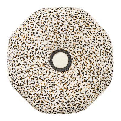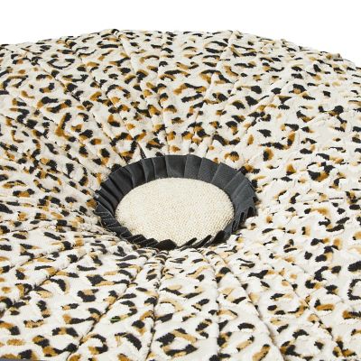 Stylishly accompany any armchair with this ample ottoman, upholstered in chenille ocelot-spot fabric and topped with a fabric button, trimmed with a grosgrain ruffe. Made start to finish in Aurora, New York, it sits on hand-painted ceramic feet and is finished with tasseled and beaded fringe.
