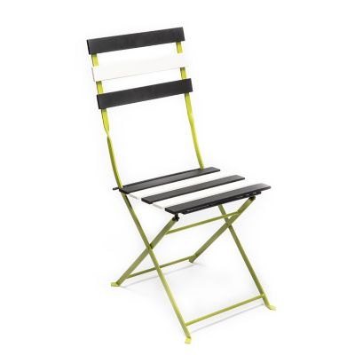 Give the patio—no matter its size—some panache with the Outdoor Black & White Metal Bistro Side Chair. Its collapsible, powder-coated iron frame is sprayed chartreuse, with black and white slats on the seat surface. Perfect for seating at the Outdoor Black & White Metal Bistro Table.