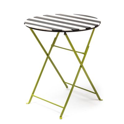 Give the patio—no matter its size—some panache with the Outdoor Black & White Metal Bistro Table. Its collapsible, powder-coated iron frame is sprayed chartreuse, with black and white slats on the table surface. Pair it with the matching Outdoor Black & White Metal Bistro Side Chair.