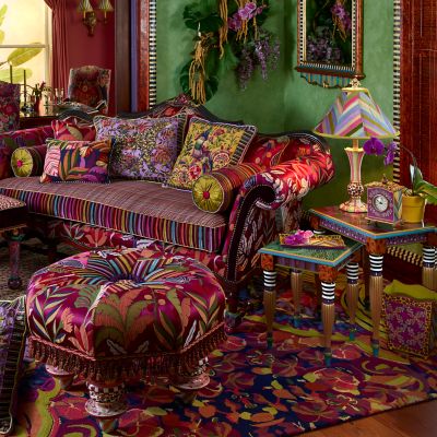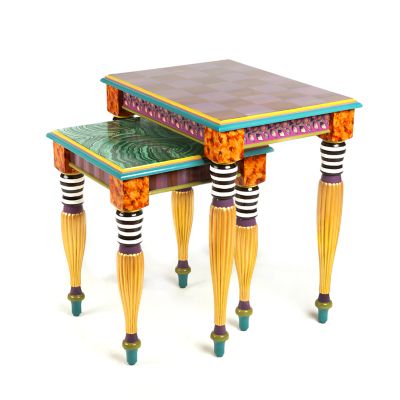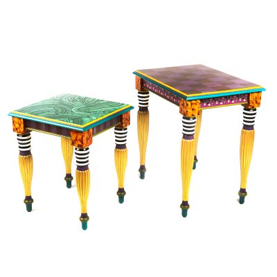 The Paradise Nesting Tables are two fun and functional end tables that can store as one but present endless possibilities for display. Lovingly decorated with hand-painted details from our master artisans in Aurora, New York, the smaller table, which has a faux malachite top, nestles under the larger table, which features Bittersweet Checks on top and faux tortoiseshell on the sides. Talk about a dynamic duo!