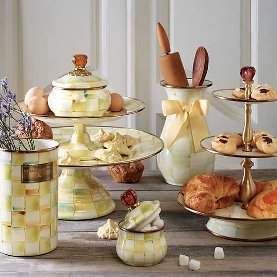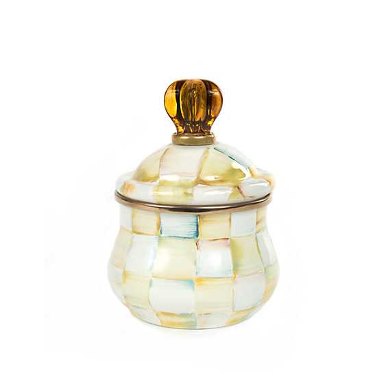 Heavy-gauge, hand-glazed steel underbody with hand-painted Parchment Checks, rimmed in bronzed stainless steel. Lid is topped with an amber-colored glass knob and brass hardware. Pieces may vary due to the handmade nature of each product. Imported.