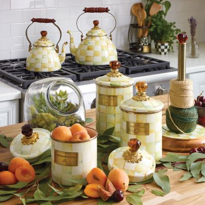 Our iconic enamelware tea kettles make their debut in Parchment Check. Ample bodied, exquisitely detailed, and just plain gorgeous. you may find yourself leaving this charming piece on the stovetop for kitchen beautification, or place it on display filled with fresh-cut flowers or greens. A perfect gift.