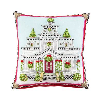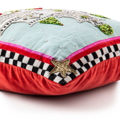 Deck the sofa with the Patience Brewster Christmas House Pillow, featuring the Patience Brewster Holiday House, embellished with embroidery and beading and trimmed with a stitched check border. The corners are accented with beaded golden stars.