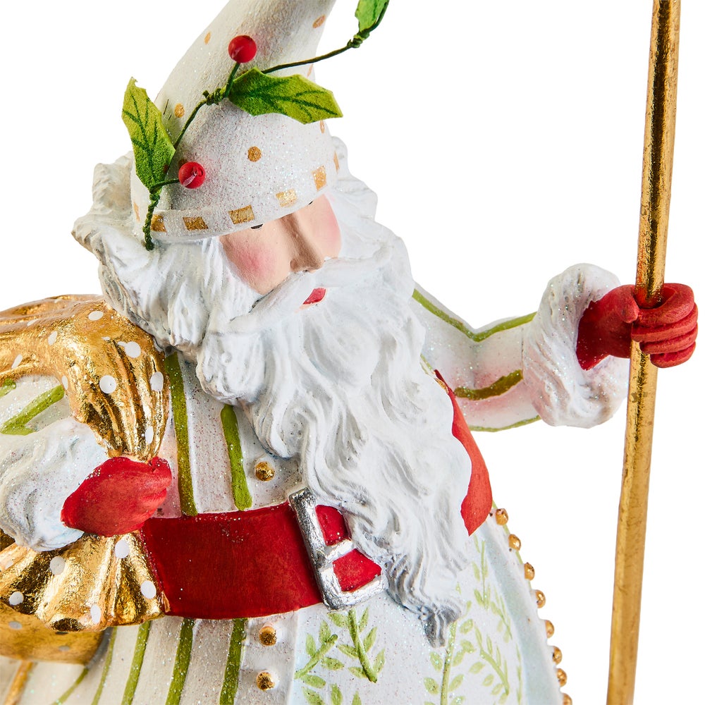 Dash Away, inspired by the Christmas classic “’Twas the Night Before Christmas,” features Santa’s eight reindeer ready to take flight around the world, assisted by their delightfully dedicated elves, Santa, and Mrs. Santa. Dressed in dramatic white, green. and gold, our Patience Brewster Dash Away Candlelight Santa Figure has a garland-wrapped hat and a candle in his staff. His golden bag is packed with toys for the midnight ride.