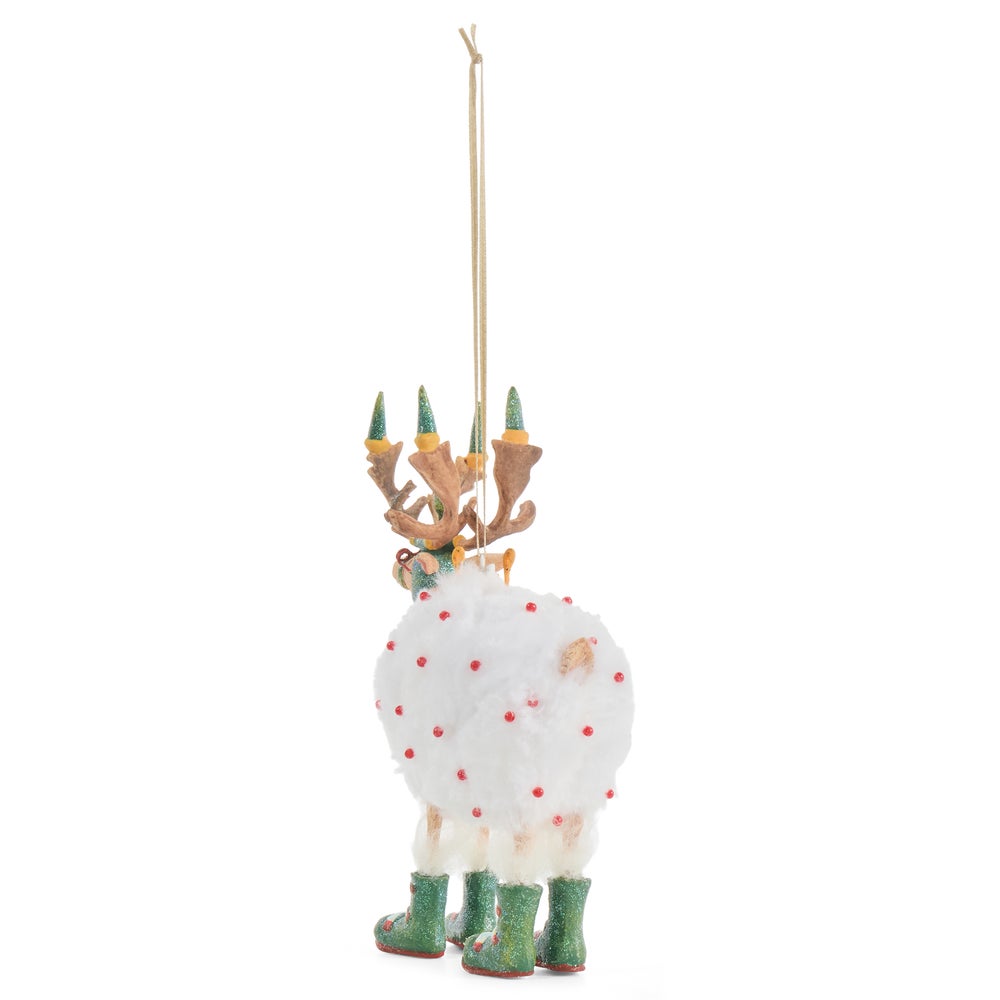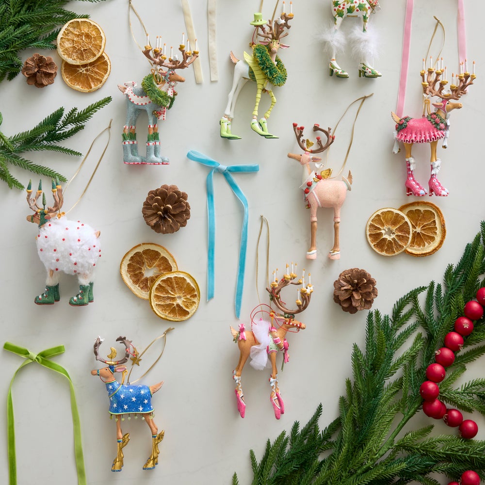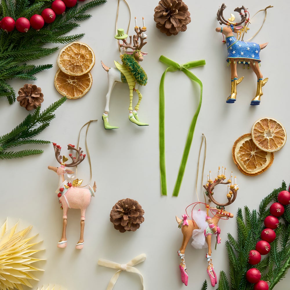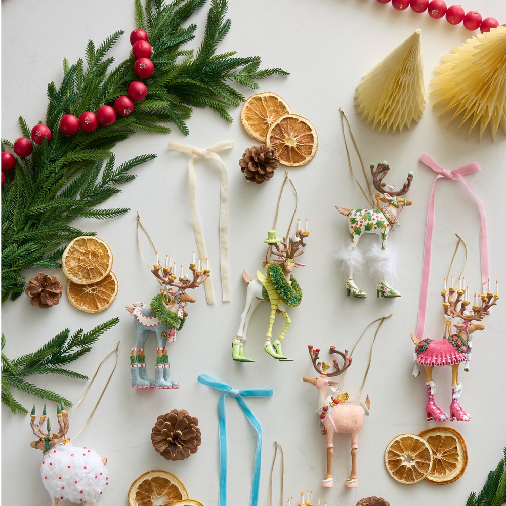 Patience Brewster Dash Away Reindeer Ornaments, inspired by the Christmas classic “’Twas the Night Before Christmas,” feature Santa’s eight reindeer ready to take flight around the world, assisted by their delightfully dedicated elves, Santa, and Mrs. Santa. Each ornament features a different Reindeer character decked in whimsy and charm.