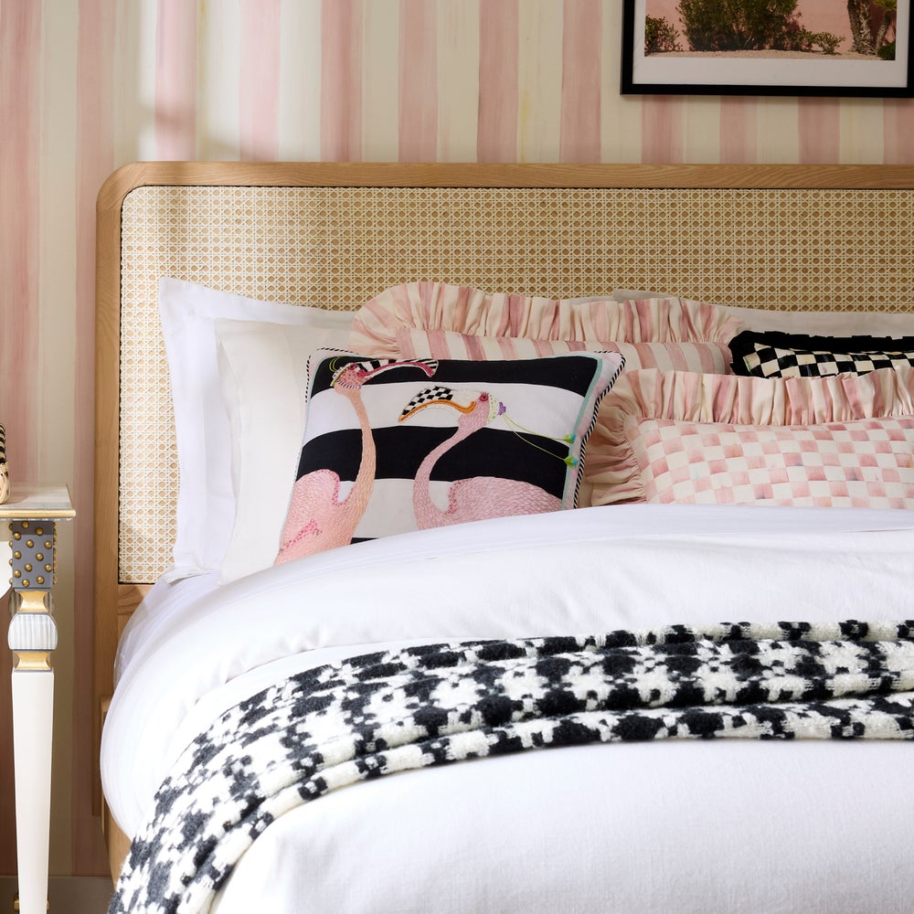 Embrace the whimsy of the Patience Brewster Flamingo Throw Pillow, featuring our favorite flamingoes, Shelia and Sheldon. It’s accented with embroidery, beading, and ribbon, and trimmed with twisted cording.