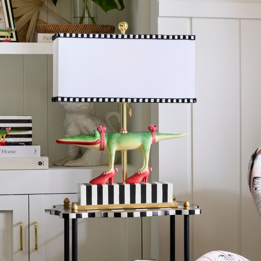 The Gloria Alligator Table Lamp is functional, of course, but it’s also fun. Featuring whimsical, hand-painted Gloria Gator on a striped base, it’s topped with a rectangular hardback shade that’s accented with textural soutache trim. The lamp cord can be adjusted to exit the base from the back or the side.