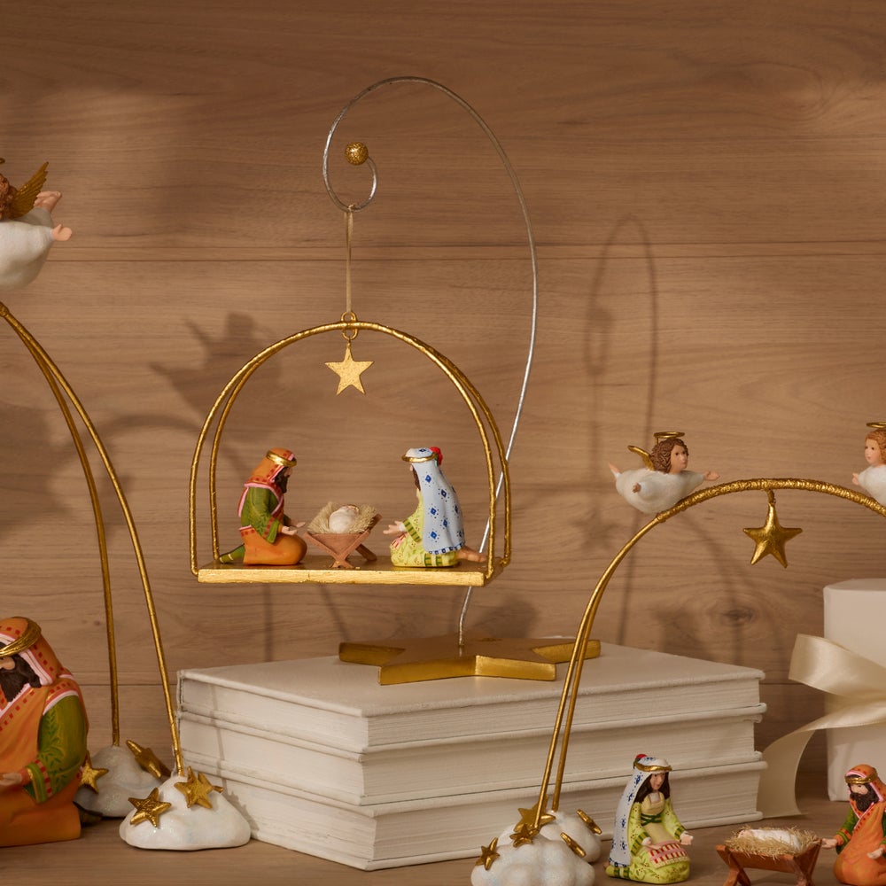 Display any of the Patience Brewster Paradise Ornaments—or any other ornament—with style on the Patience Brewster Golden Star Ornament Stand. The wire holder extends from a star-shaped base that’s decorated with gold leaf and holographic glitter.