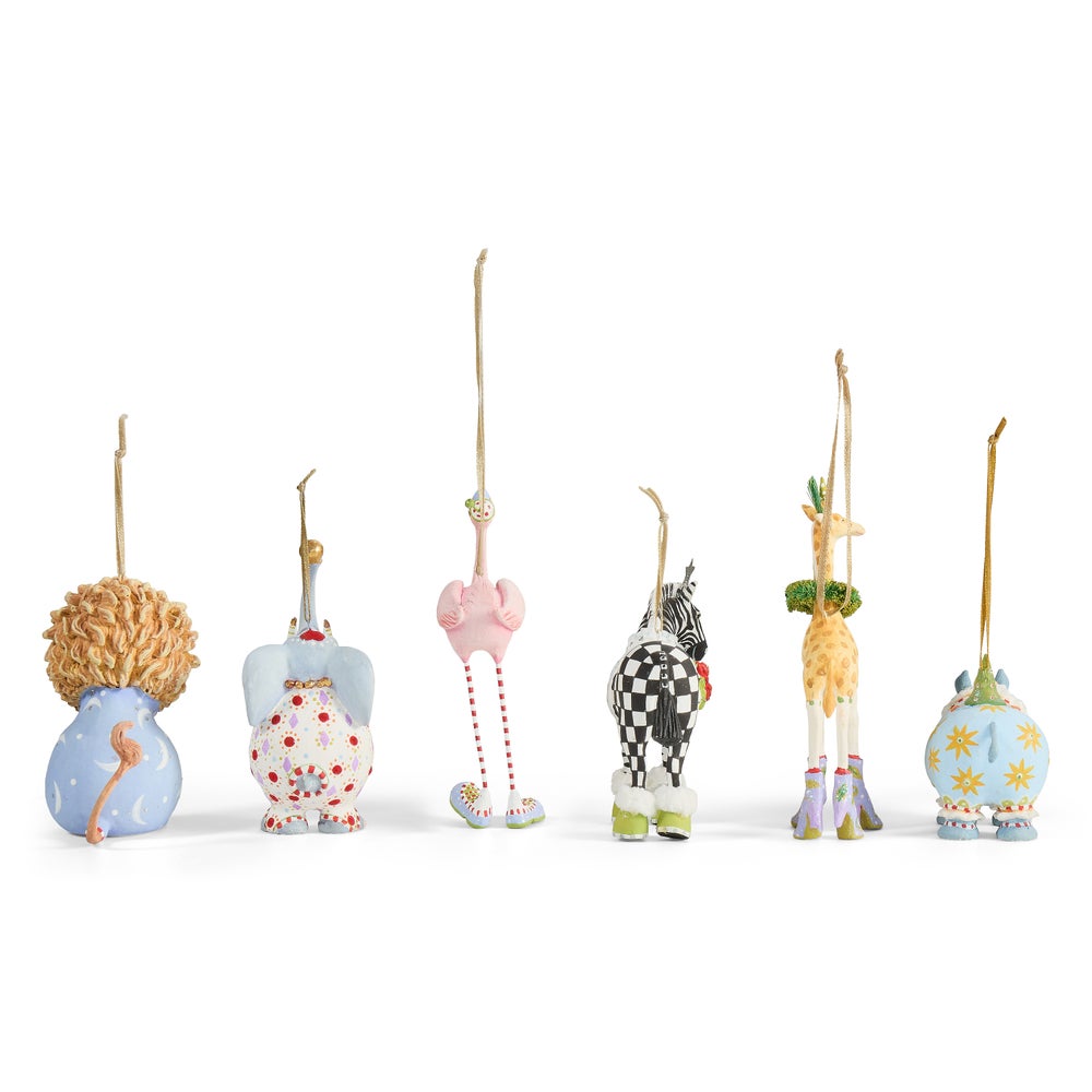 | Dimensions | Set includes: 1 Janet Giraffe Mini Ornament (4.5” tall), 1 Zelda Zebra Mini Ornament (3.5” tall), 1 Richard Lion Heart Mini Ornament (3.5” tall), 1 Eleanor Elephant Mini Ornament (4” tall), 1 Sheldon Flamingo Mini Ornament (4.5” tall) and 1 Roberta Rhino Mini Ornament (2.5” tall). |