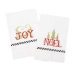 The embroidered set of two Patience Brewster Joy & Noel Tea Towels are sure to bring a festive feel to your kitchen or powder room, or as a generous napkin on your table. They feature whimsical elves expressing seasonal sentiments with a border of checks. These towels love to hang with the set of two Patience Brewster Peace & Love Tea Towels.